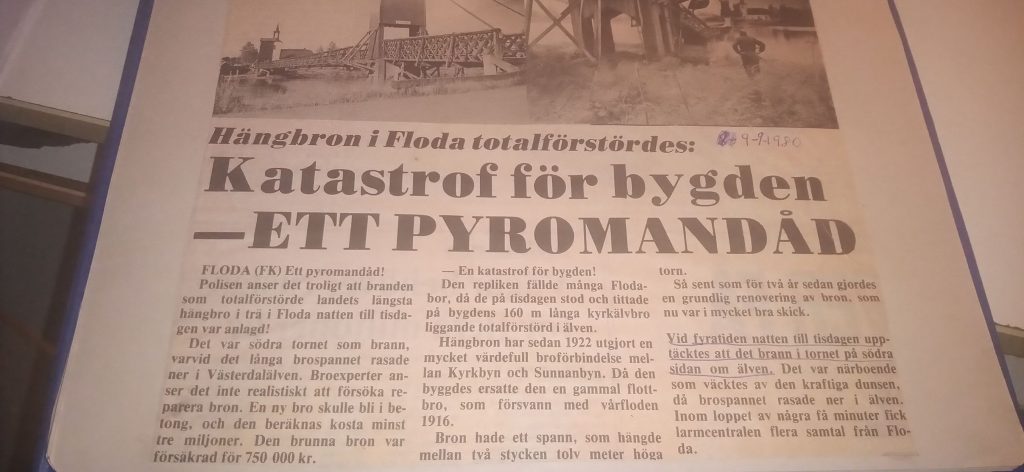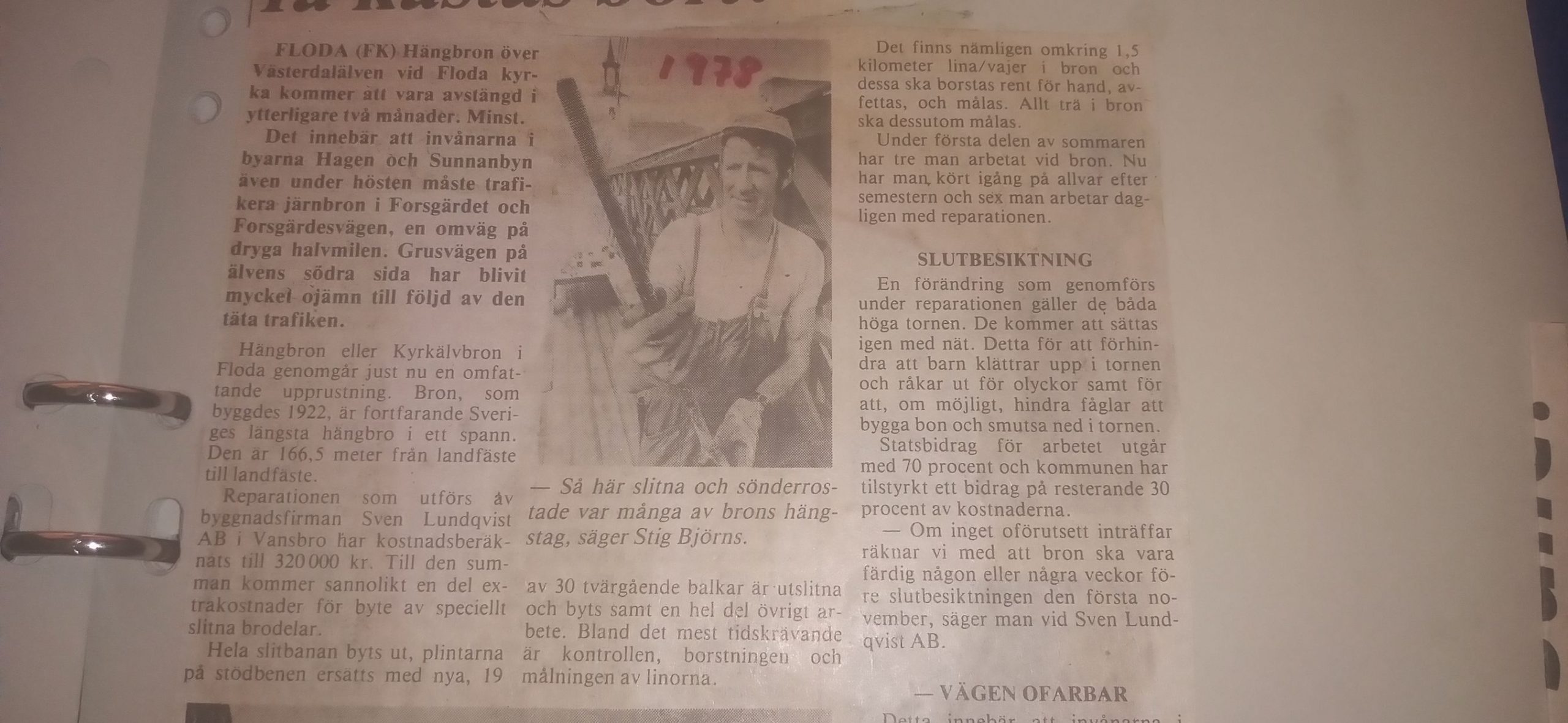 Tidningen har till sitt förfogande tidningsurklipp från 80-talet, då bron brann ned och byggdes upp igen. Jag tycker det skulle vara intressant att göra en jämförelse mellan nu och då. Redan 1978 skrev Falukuriren om dåtidens renovering, alltså innan bron brann ner, ett arbete som gick på 320.000 kr och bekostades 70/30% av stat/kommun. 2 år senare förstördes bron och man skrev i FK att en ny bro i betong skulle gå på 3 miljoner (runt 10,2 miljoner idag) men vilken tur att den planen inte gick igenom utan att bygdens symbol då kunde bevaras. Det var dock ingen självklarhet, det skulle bli dyrt och var inga pengar som bygden skulle kunna samla ihop på egen hand. En aktionsgrupp och hembygdsföreningen engagerade sig för att bygga upp bron som den var. En argumentation som då fördes fram av Bo Frans (drivande i aktionsgruppen) var att det skulle bli lättare att få statliga bidrag för återuppbyggnad av en kulturmärkt bro än en betongbro då järnbron redan fanns. Om man sen kunde sköta demonteringen av den förstörda bron genom frivilliga kunde försäkringspengarna på 700.000 kr användas till en återuppbyggnad istället.