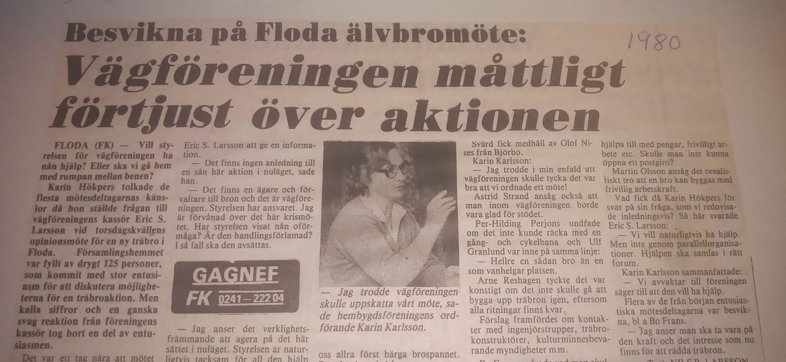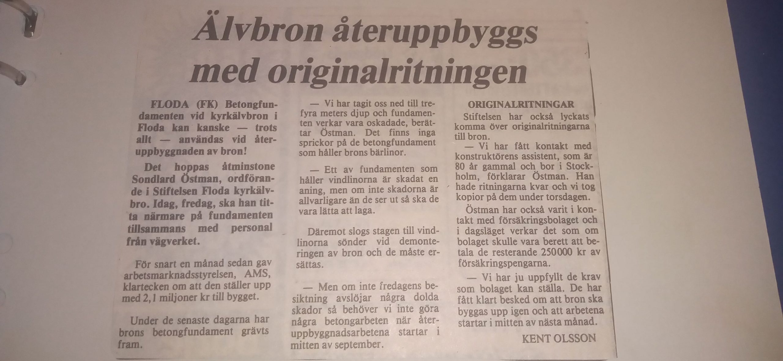 Bybor skänkte skog för återuppbyggnaden, däribland Anna Larsson från Hagen för ett belopp på 100.000 kr (340.000 idag). Viss dramatik ägde rum med den förra brons ägare vägföreningen men man kunde till slut enas och dagens stiftelse bildades. Brobygget fick 2,1 miljoner i bidrag från dåvarande Arbetsmarknadsstyrelsen (dagens Arbetsförmedling) och man letade reda på originalritningarna för bron. Även kommunen gick med på att stötta brouppbyggnaden med teknisk expertis och viss ekonomisk hjälp. Här följer lite urklipp, tyvärr gick materialet endast till 1981 men vi vet nog hur berättelsen slutade. NDT om vi får in mer material återkommer gärna till denna berättelse.