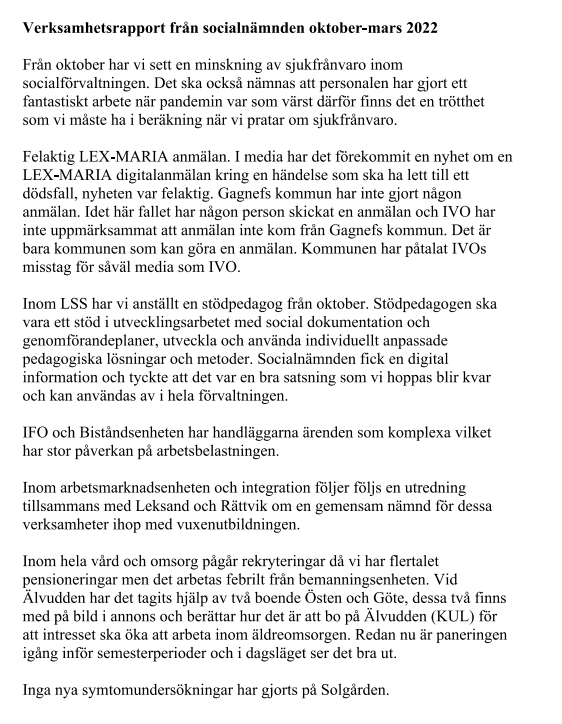 Istället för att gräva djupare i argumenten om löner har vi på NDT en annan vinkel på måndagens kommunfullmäktige. Det att man i Socialnämndens verksamhetsrapport inte nämnde att man var under IVO-tillsyn. För att vara generös, kan vi kanske säga att man inte vill dela med sig förrän tillsynen är avklarad. Men faktumet att kommunen är under tillsyn och man inte nämner det i en rapport är något häpnadsväckande. Vi har även frågat Socialnämndens ordförande Irene Homman (S) om en kommentar, hon har inte återkommit efter två dagar. Så vad är det man då säger i denna rapport?