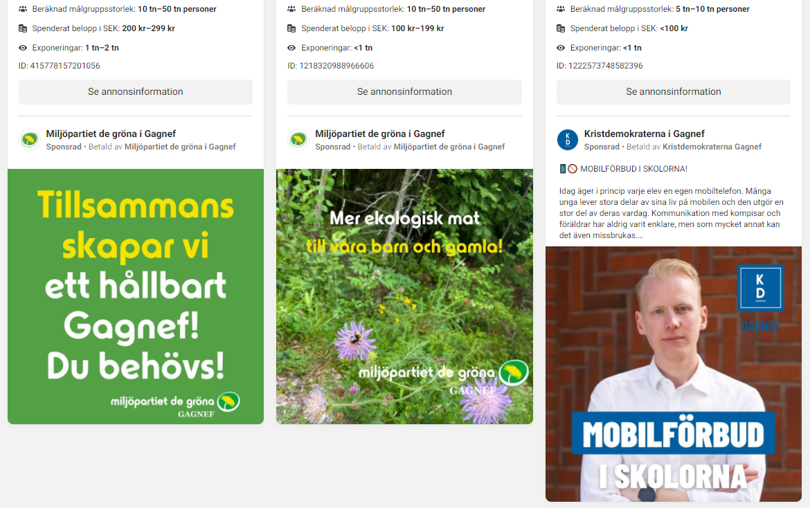 Denna artikel bygger på Facebooks egen databas på reklam, se själv här. Om Facebook anger kostnad i formatet 200-299 kr, använder vi medelvärdet dvs. 250 kr. Om en annons understiger 100 kr, antar vi ett värde på 50 kr. Vi reserverar oss att siffrorna är en uppskattning av den minsta spenderade summan (att vi kan ha missat enstaka annonser).